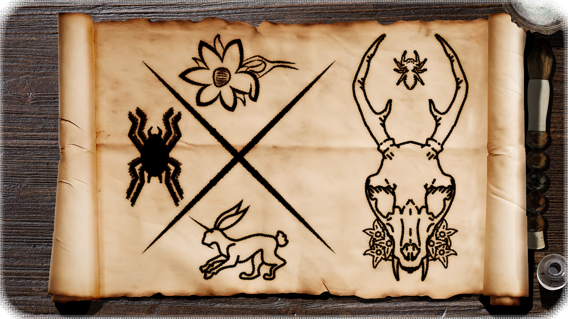 In nature, it's been known for spiders to make webs in the antlers of various animals, a mutualistic relationship for both the spider and the animal. The animal in question is a fanged jackalope, a mystical animal across many cultures. This harrowing skull and spider combined with the six blooms of deadly nightshade nestling it's cheeks, make the icon of Harrowshade.
