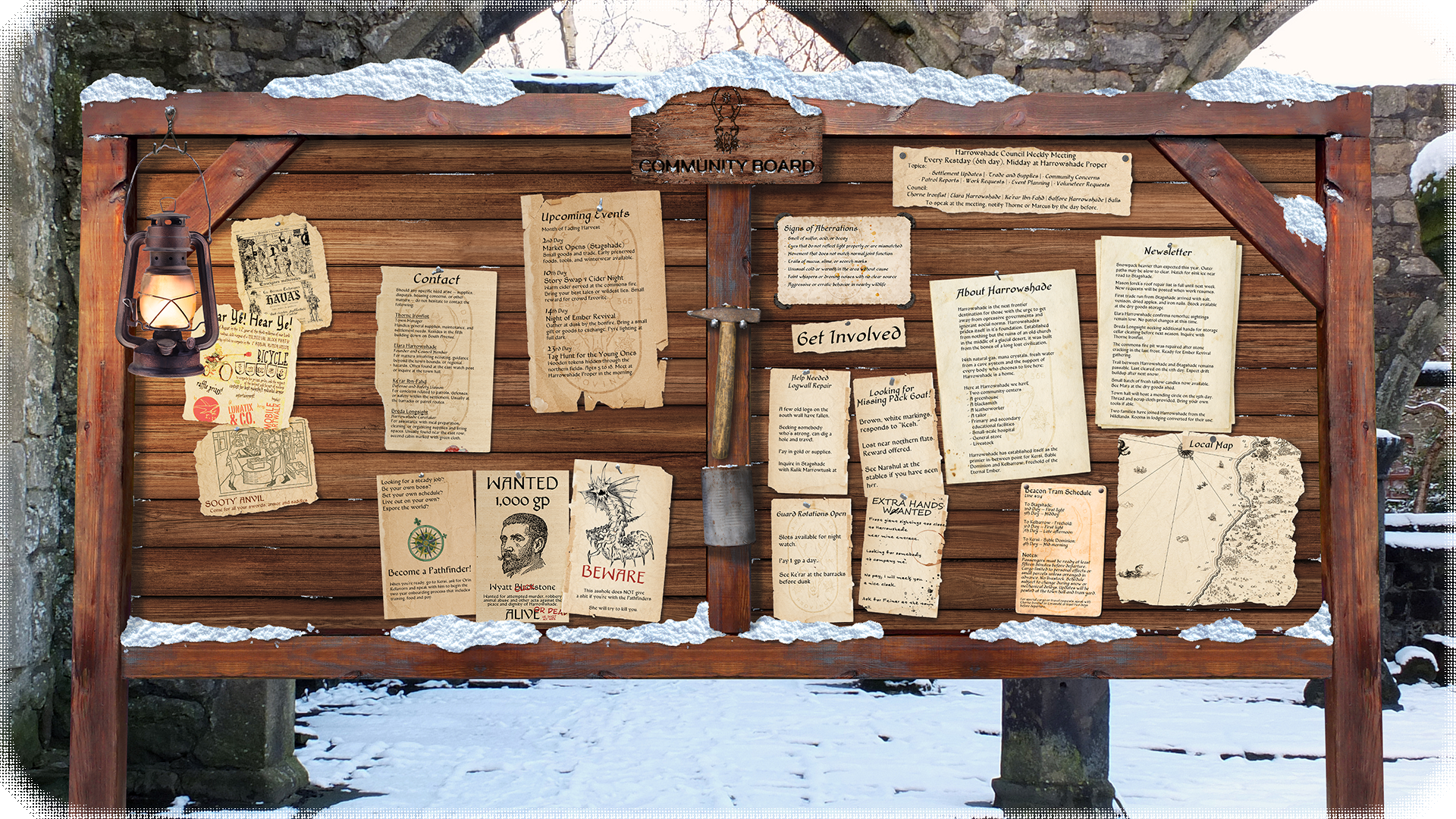 How could a city website be interpreted in a time without computers? A physical bulletin board in front of the city center or other essential locations where people gather socially. This board functions similar to a modern day website; jobs, warnings, bounties, events, contact information, advertisements, and even an about page for passing visitors.