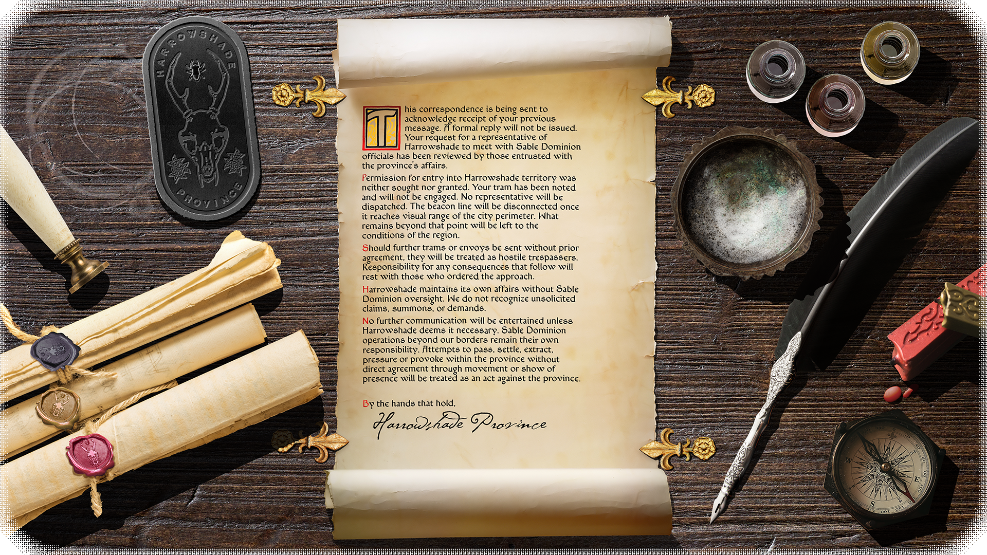 When researching historial applications of official design, one of the things that stood out the most was a Mongolian tablet of authority. Otherwise known as a paiza, paizi, or gerege. While it would've been appropriate to rely on heraldry for this city branding, it felt more appropriate to lean on Harrowshade's presence in regional trade amongst the cities. Existing along a intercontinental tram line, it allowed Harrowshade to cement itself in specific avenues of trade. Livestock, herbs, medicine, ciders, and beast products (such as remorhaz).