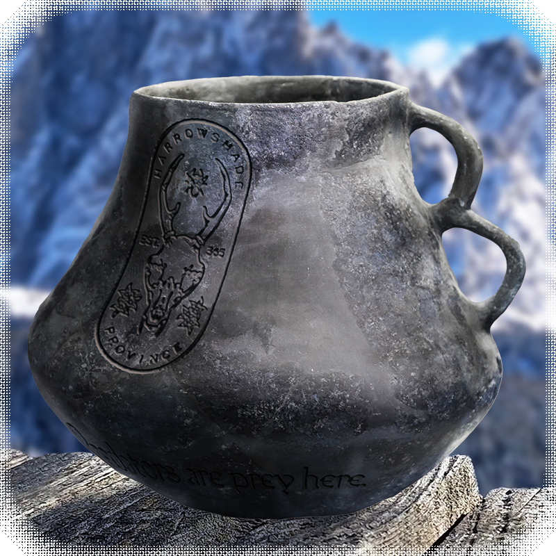 It would be easy to pick some classic merchandise that are commonly found at renaissance festivals and other businesses shaped around the medieval period. A shield bearing the Harrowshade coat-of-arms, sword with the tagline in two languages, waterskins, pottery, and cutlery.