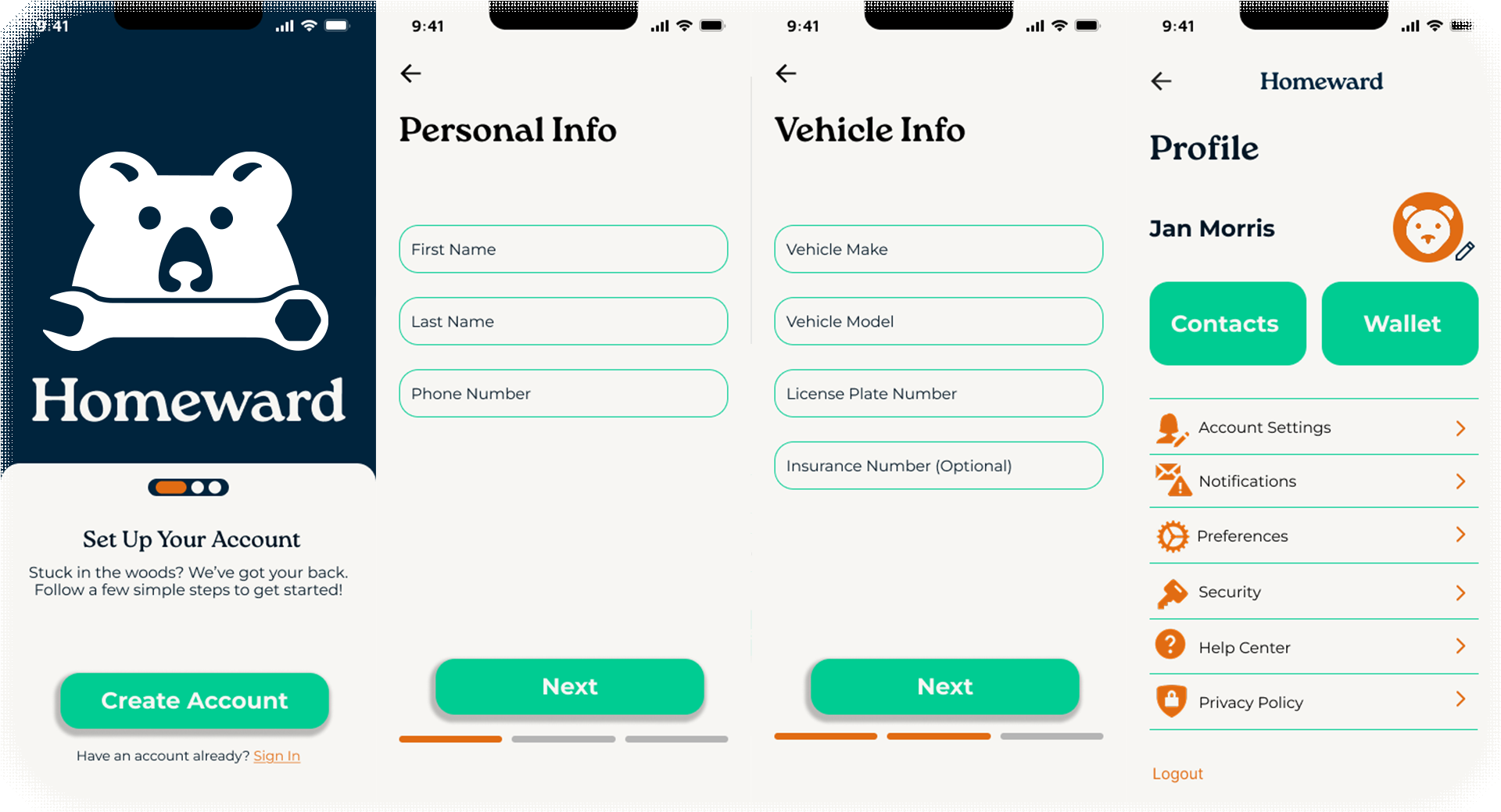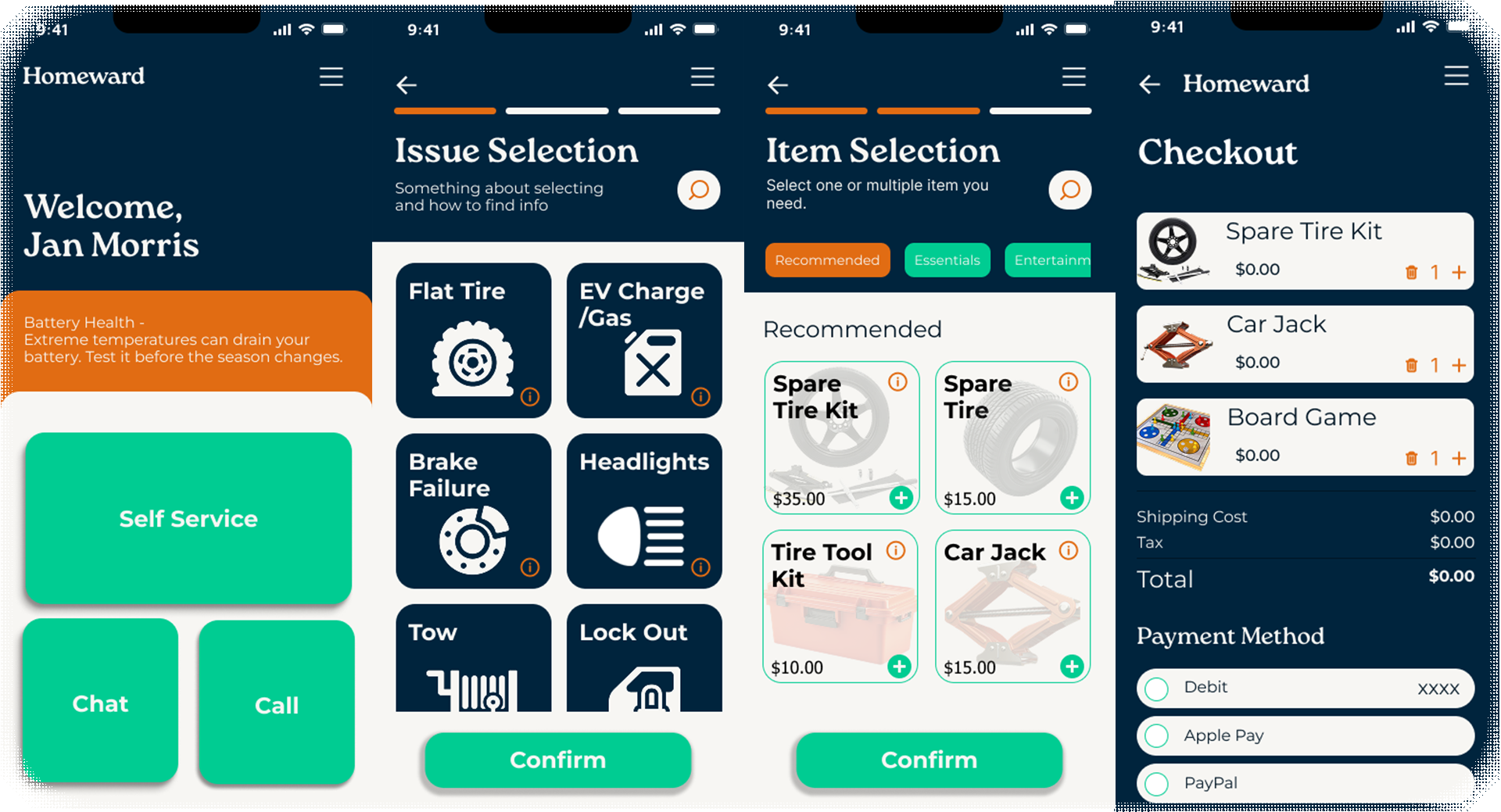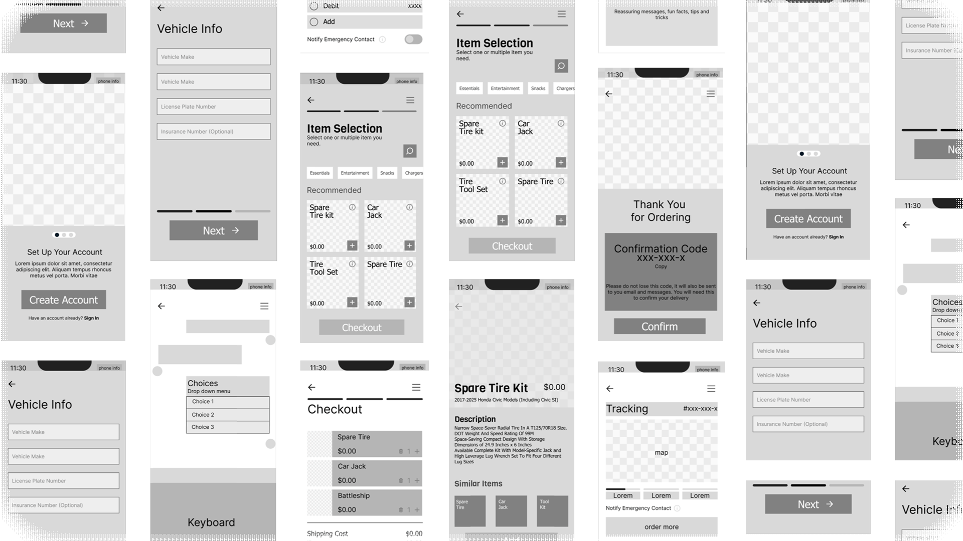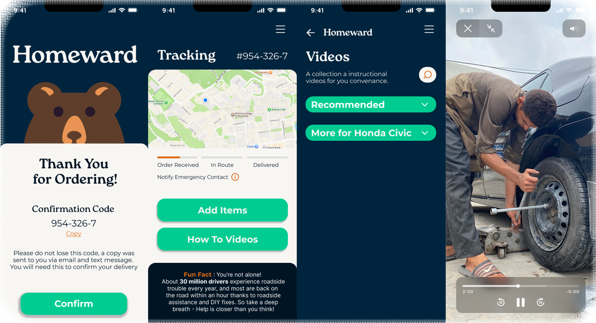 The first round of users felt like inputting their car information, name, and payment information was overpowering. Alternative is to allow ease of login with Apple and Google. Past that, users desired to select their issues before deciding whether or not to self service or call for assistance. They were satisfied with the information presented on the confirmation screen; order number, time till delivery, live tracking, and the ability to opt in for texts. A few users suggested that snacks be a purchasable option just in case they're needing to wait a while longer. When presented with an animal mascot, a large amount of users picked the bear. They said it was a strong, reliable, and fast animal. That feedback is what influenced the branding and colors of the app in the second stage of development.