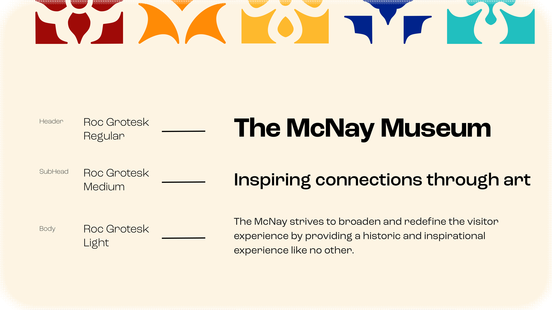 Pulling inspiration from the tiles present along the walls and the stairs of the Museum, a symmetrical floral design grew. The Spanish colonial architecture and the purpose of the location itself, lead us to developing a simplified historic tile mark. Paired with Articulat CF, a modern and minimal Sans Serif, it became a solid badge worthy of such a revolutionary location.